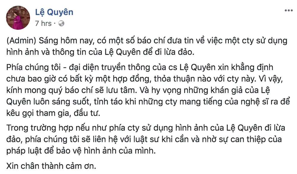 Cụ thể: “Phía chúng tôi, đại diện truyền thông của ca sĩ Lệ Quyên xin khẳng định chưa bao giờ có bất kỳ hợp đồng, thỏa thuận nào với công ty này. Vì vậy, kính mong quý báo chí sẽ lưu tâm và hi vọng những khán giả của Lệ Quyên sẽ luôn sáng suốt, tỉnh táo khi những công ty mang tiếng của nghệ sĩ ra để kêu gọi tham gia, đầu tư”.