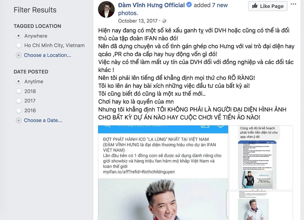 Đàm Vĩnh Hưng là nghệ sĩ bị lợi dụng hình ảnh nhiều nhất trong vụ lừa đảo lần này. Hồi tháng 10-2017, anh đã từng cảnh báo mọi người ngay trên fanpage cá nhân và cho biết không phải là người đại diện hình ảnh cho bất kì dự án nào về tiền ảo.