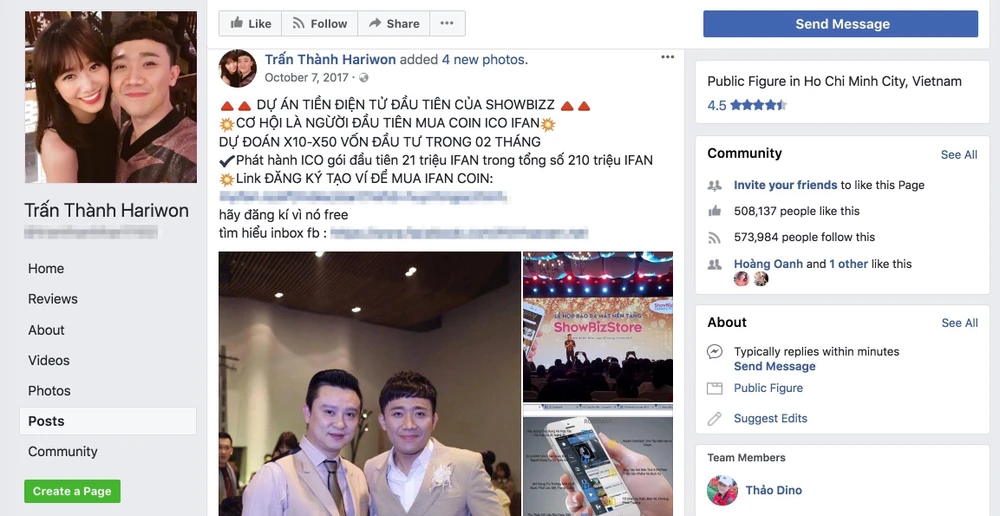 Cụ thể, một fanpage giả mạo Trấn Thành Hariwon đã đăng tải bài viết dụ dỗ người dùng tham gia vào dự án tiền điện tử đầu tiên của Showbiz. Tất nhiên, cũng không loại trừ khả năng có một người nào đó đã mua quảng cáo trên trang này, một fanpage có hơn 500.000 lượt thích và theo dõi.