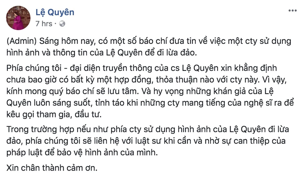 Tương tự, chiều tối qua (9-4-2018, người đại diện của ca sĩ Lệ Quyên cũng lên tiếng về việc hình ảnh của cô bị lợi dụng để đi lừa đảo.