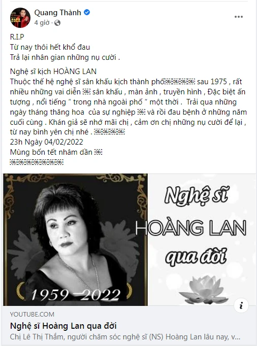 Tối 4-2 (mùng 4 Tết) nghệ sĩ Hoàng Lan đã qua đời ở tuổi 64 tại nhà thuê ở quận 11, TP.HCM sau hơn 10 năm chống chọi với bệnh tật.