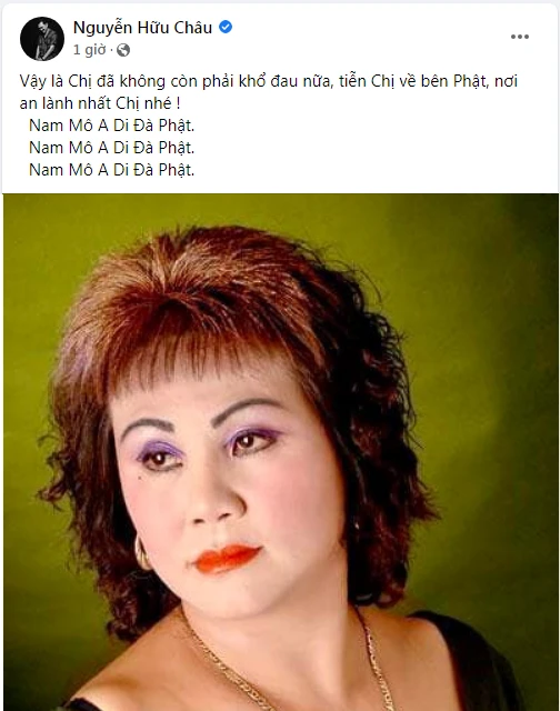 Trên facebook cá nhân, NSƯT Hữu Châu cũng bày tỏ:"Vậy là Chị đã không còn phải khổ đau nữa, tiễn Chị về bên Phật, nơi an lành nhất chị nhé ! Nam Mô A Di Đà Phật".