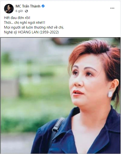 Trên Fanpage cá nhân, MC Trấn Thành viết: "Hết đau đớn rồi! Thôi... chị nghỉ ngơi nhé! Mọi người sẽ luôn thương nhớ về chị.