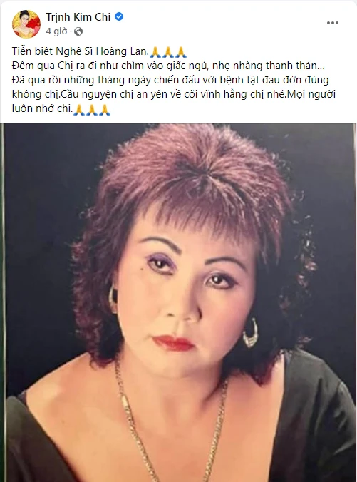 NSƯT Trịnh Kim Chi tiếc thương:"Tiễn biệt Nghệ sĩ Hoàng Lan. Đêm qua chị ra đi như chìm vào giấc ngủ, nhẹ nhàng thanh thản.