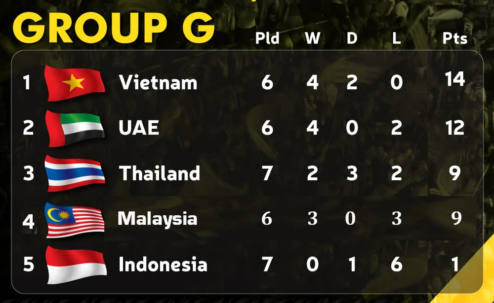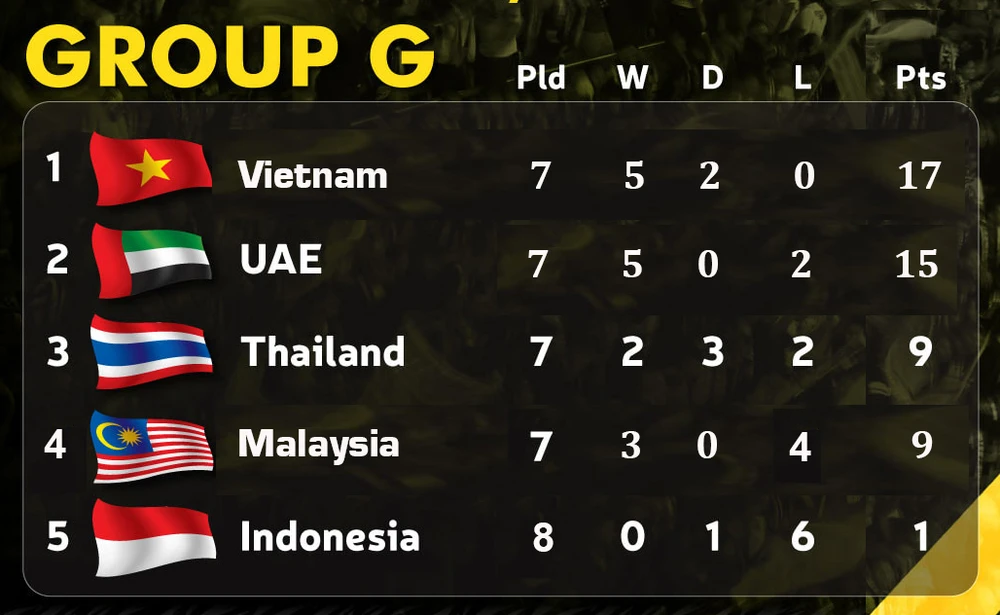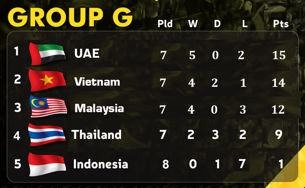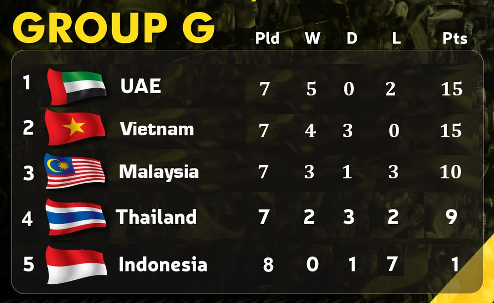Với bảng xếp hạng hiện tại, Việt Nam đang dẫn đầu với 14 điểm còn gặp Malaysia, UAE, kế đến là UAE thua 2 điểm còn gặp Indonesia, Việt Nam; Thái Lan 9 điểm nghỉ lượt trận này, trận cuối đá với Malaysia. Xếp thứ tư bảng là Malaysia, họ cùng 9 điểm bằng Thái Lan nhưng xếp dưới vì kém chỉ số phụ (Malaysia còn gặp Việt Nam, Thái Lan). Indonesia xếp cuối với 1 điểm còn một lượt trận gặp UAE.
