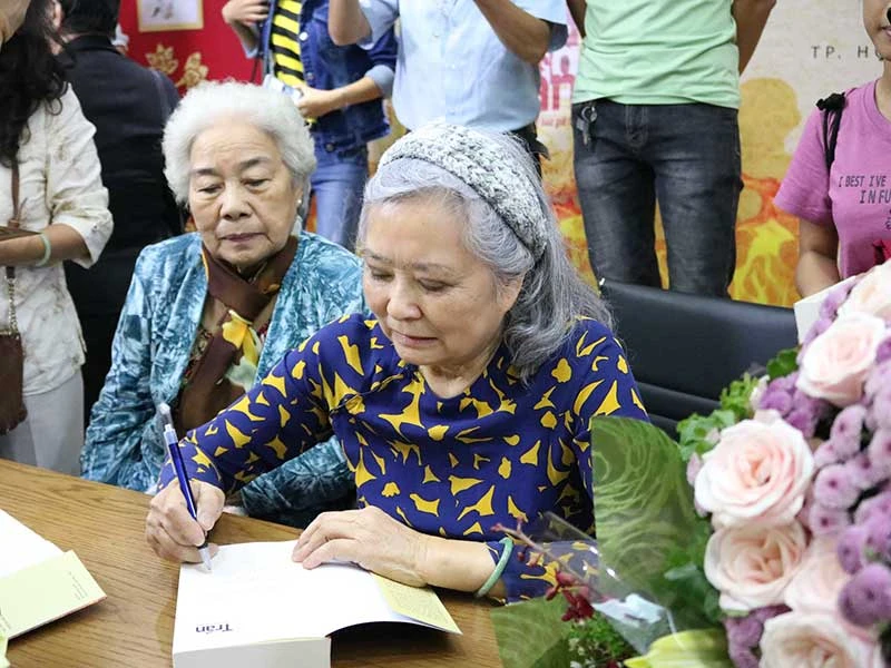 Bà Trần Tố Nga trong buổi ra mắt cuốn Đường trần - Ngọn lửa không bao giờ tắt vào cuối tháng 8 vừa qua. Ảnh: THANH TUYỀN