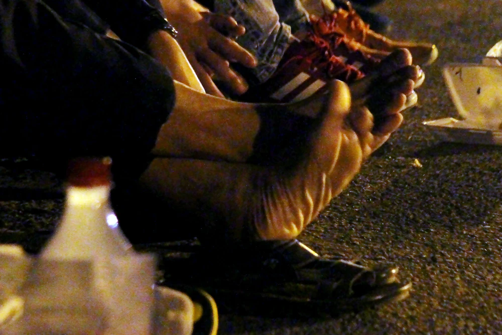 Đôi chân co quắp vì giá lạnh của một cổ động viên Việt Nam.