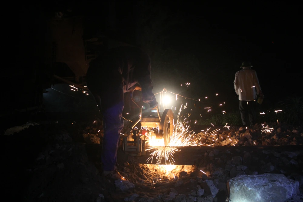 Nhân viên đường sắt đang cắt bỏ đường ray bị hư. Ảnh chụp lúc 2 giờ 30 phút sáng.