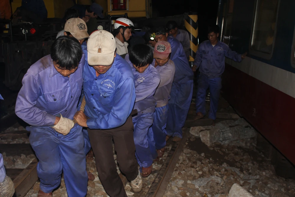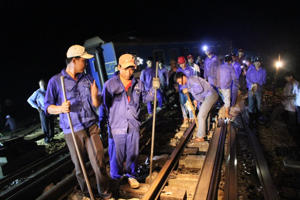 Các công nhân được huy động để sửa chữa đường ray ngay trong đêm