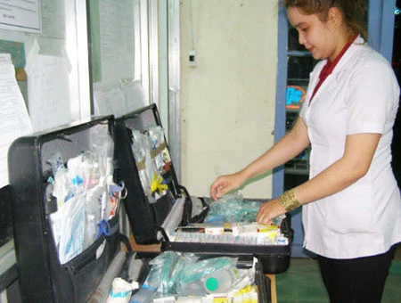 Điều dưỡng Trịnh Hoài Phương chuẩn bị đầy đủ dụng cụ dùng trong cấp cứu. Ảnh: TRẦN NGỌC