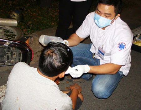 Nhân viên cấp cứu xử lý vết thương cho người bị nạn tại hiện trường. Ảnh: TRẦN NGỌC