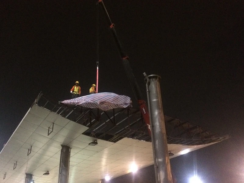 Các công nhân được cần cẩu đưa lên để tháo dỡ phần mái của trạm thu phí.