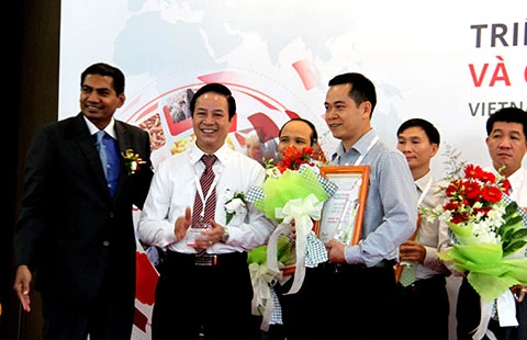 Ông Lê Văn Dũng - Giám đốc Trang trại bò sữa Vinamilk Nghệ An nhận giải thưởng do TS Hoàng Thanh Vân - Cục trưởng Cục Chăn nuôi, Bộ NN&PTNT trao tặng.