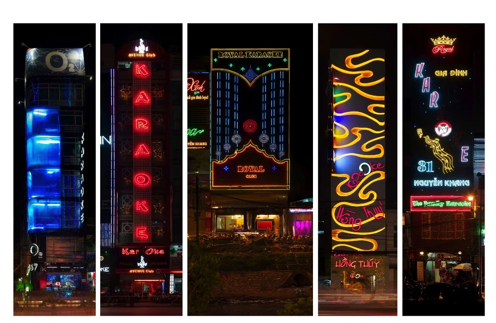 Hình ảnh mặt tiền các quán karaoke được họa sĩ Nguyễn Thế Sơn ghi lại.