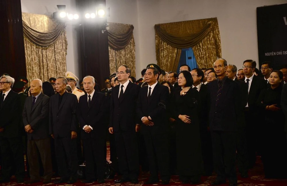 Đoàn đại biểu Thành ủy - HĐND - UBND - Ủy ban MTTQ Việt Nam TP.HCM cùng các nguyên lãnh đạo Đảng, Nhà nước đã nghỉ hưu tại TP.HCM do Ủy viên Bộ Chính trị, Bí thư Thành ủy Nguyễn Thiện Nhân dẫn đầu đã vào viếng.