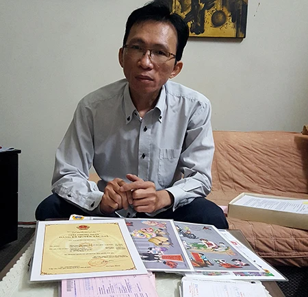 Họa sĩ Nguyễn Văn Lộc cùng giấy chứng nhận đăng ký quyền tác giả. Ảnh: L.TRINH