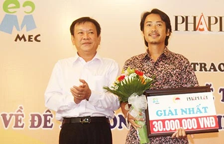 Ông Mai Ngọc Phước, Phó Tổng Biên tập phụ trách báo Pháp Luật TP.HCM, trao giải nhất cho tác giả Lê Phương (Leo). Ảnh: V.THỊNH