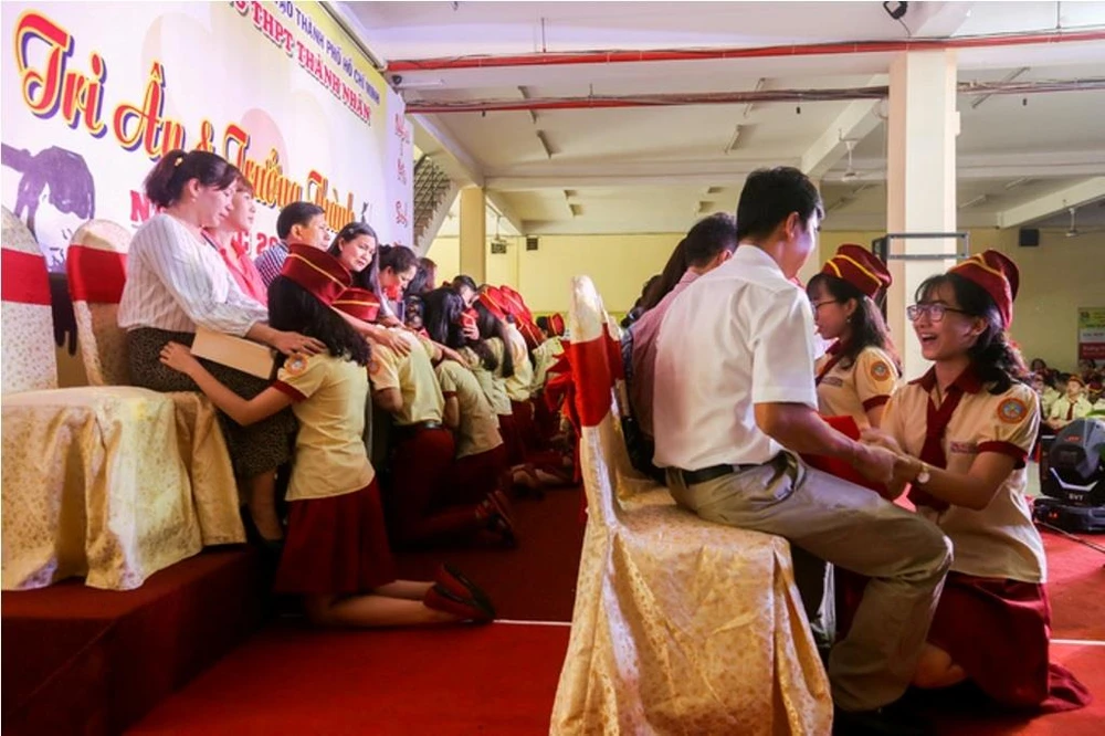 Mới đây, tại một trường THPT trên địa bàn TP.HCM đã tổ chức lễ tri ân, trưởng thành. Tại đó, học sinh khối lớp 12 đã dành tặng những món quà, lời tri ân cho thầy cô, cha mẹ trước khi từ biệt mái trường.