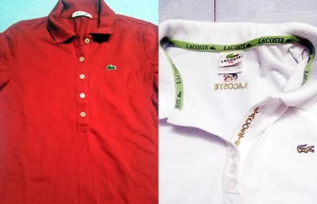 Áo thun đỏ Lacoste thật (trái) và hàng tang vật. Ảnh: H.YẾN