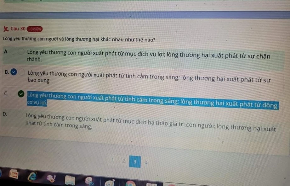 Cụ thể, ở câu 30, đề hỏi “lòng yêu thương con người và lòng thương hại khác nhau như thế nào?” và đưa ra bốn phương án lựa chọn. Gồm: