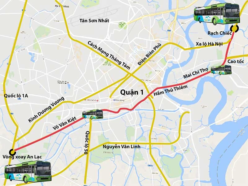 Theo đó, kế hoạch xây dựng tuyến BRT số 1 nằm trong dự án phát triển giao thông xanh TP.HCM. Tuyến này nằm trên hành lang đại lộ Võ Văn Kiệt - Mai Chí Thọ với tổng chiều dài là 23 km. Lý trình trong năm khai thác đầu tiên (2019) là từ vòng xoay An Lạc tới Rạch Chiếc. Lượng hành khách bình quân trên tuyến BRT số 1 là 10.200 hành khách/ngày trong năm đầu tiên.