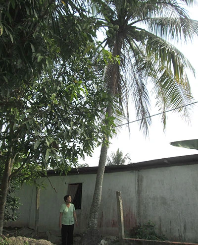 Cây dừa kỷ niệm của bị đơn nghiêng hẳn sang phía nhà bà Trương Thị Nhỏ. Ảnh: THÙY DUNG