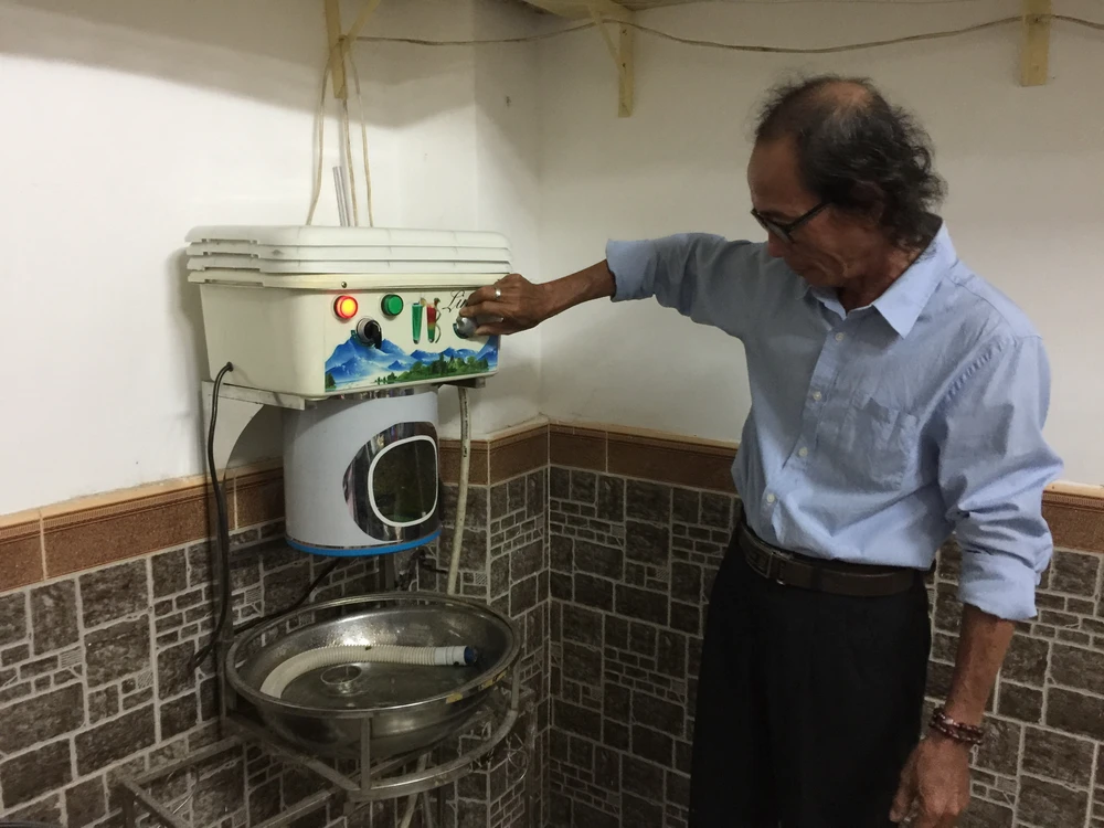 Nhà sáng chế Nguyễn Duy Linh bên chiếc máy rửa ly của mình, tại nhà riêng chiều 22-2. Ảnh: Quỳnh Như