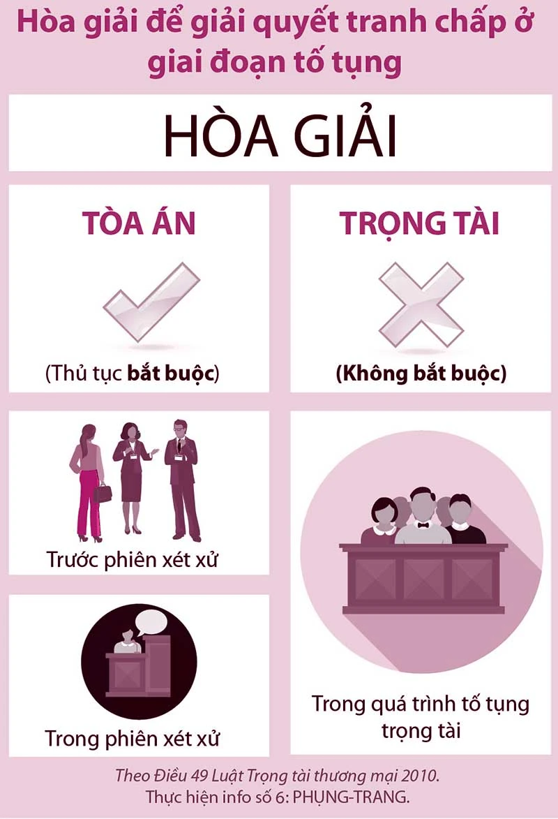 Theo luật sư (LS) Nguyễn Văn Hậu, Chủ tịch Hội TTTM TP.HCM, thủ tục hòa giải giữa cơ quan trọng tài và tòa án khác nhau. Cụ thể, đối với tòa án thì thủ tục hòa giải là bắt buộc. Tòa hòa giải trước phiên xử và thậm chí ngay tại phiên xử, tòa cũng hòa giải.