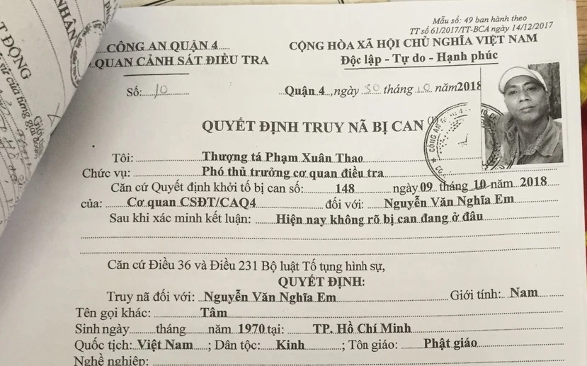 Quyết định truy nã bị can Nguyễn Văn Nghĩa Em của Công an quận 4.