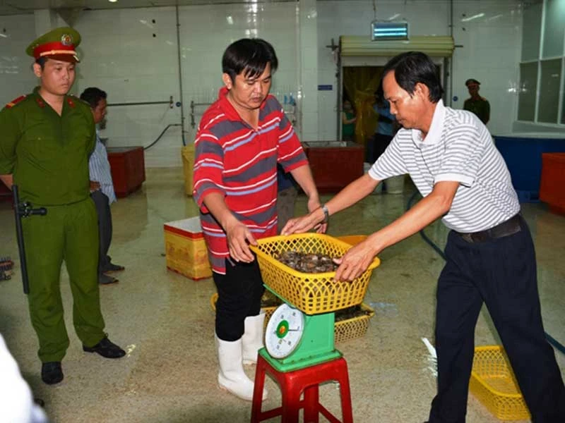 Một vụ tôm chứa tạp chất bị bắt quả tang tại tỉnh Cà Mau. Ảnh: Trần Hiếu