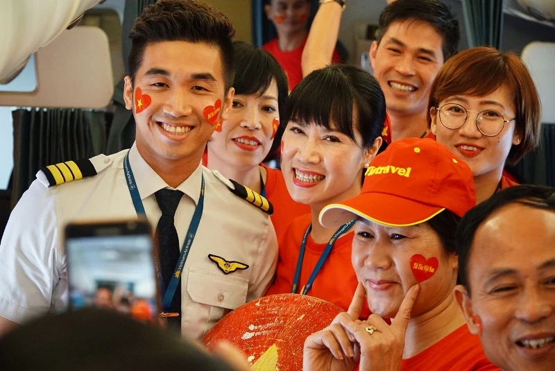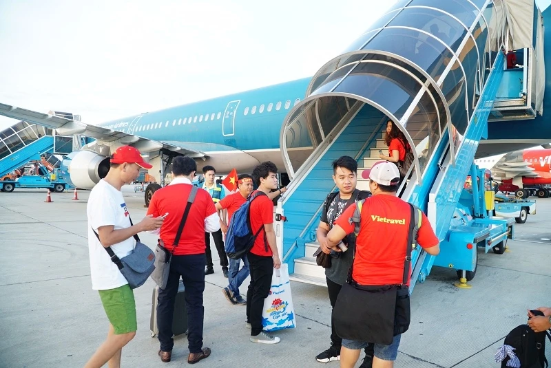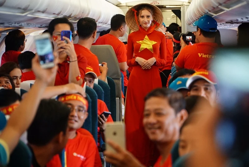 Theo Công ty Du lịch Vietravel, sáng nay tại sân bay Tân Sơn Nhất, 100 người hâm mộ trên chuyến bay thuê bao Vietnam Airlines tiếp tục lên đường sang Indonesia cổ vũ cho tuyển Olympic Việt Nam tranh huy chương đồng vào 15 giờ.