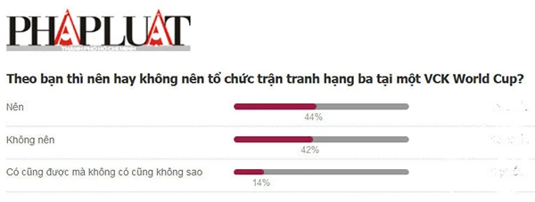 Nhân sự kiện này, Pháp luật TP.HCM Online cũng tiến hành cuộc thăm dò nhỏ để bạn đọc bầu chọn nên hay không tổ chức trận tranh hạng ba World Cup. Theo kết quả thăm dò tính đến 11 giờ trưa ngày 12-7, hiện có 44% bạn đọc cho rằng nên tổ chức trận tranh hạng 3, 42% cho rằng không nên, còn lại 14 bạn đọc cho rằng có trận tranh hạng ba cũng được và không có cũng không sao. Với kết quả này có thể thấy rõ các ý kiến nên hay không nên tổ chức trận tranh hạng ba vẫn gần như là 50-50.