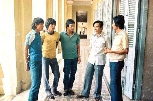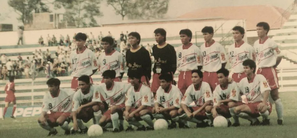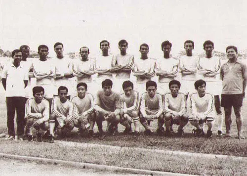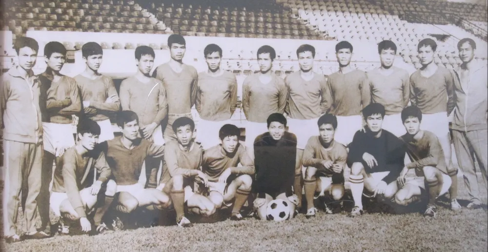 Đội Tổng cục Đường Sắt trước trận đầu tiên giữa hai miền Nam - Bắc sau ngày thống nhất đất nước trên sân Thống Nhất. Ảnh: TƯ LIỆU