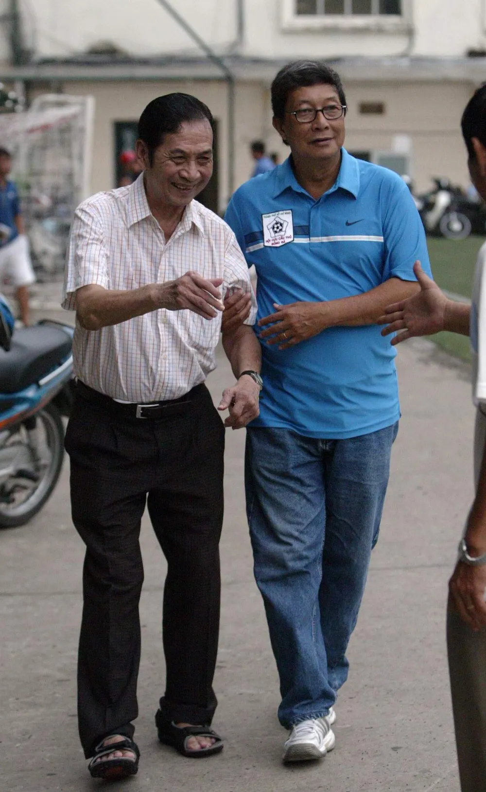 Ông Tam Lang, một phần của đội Cảng Sài Gòn được nhà báo Hồ Nguyễn dìu ra sân Thống Nhất. Ảnh: XUÂN HUY
