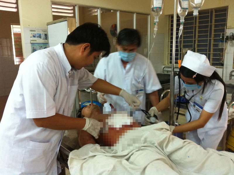 Trước đó, bệnh nhân D. được người dân đưa đến BV Chợ Rẫy trong tình trạng bị hơn chục vết thương trên người, một con dao cắm xuyên qua lồng ngực.