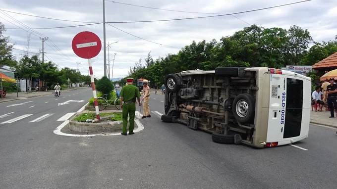 Tài xế Minh ngoặt lái tránh chị Phượng nên xe đập vào con lươn lật nhào giữa đường. Rất may hành khách trên xe không có ai bị thương.