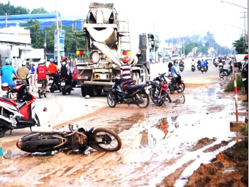 Khi đến khu vực thuộc khu phố 6 (phường Thới Hòa, thị xã Bến Cát), thấy vũng lầy từ một công trình làm đường thoát nước ven quốc lộ nên Ngân tránh bằng cách đánh lái ra ngoài làn đường dành cho ô tô.