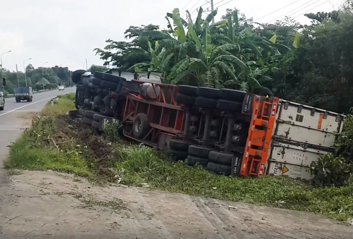 Thông tin ban đầu, container mang biển số 72R-012.11 chạy trên quốc lộ 1A theo hướng từ tỉnh Bình Thuận đi TP.HCM. Khi đến đoạn đường trên, phát hiện có một xe khách chạy theo chiều ngược lại đã lấn sang làn đường bên trái vượt một xe tải chạy phía trước, để tránh tai nạn xảy ra, tài xế container đã đánh lái sang phải để né cú đấu đầu nên xe bị lật nhào xuống vệ đường.