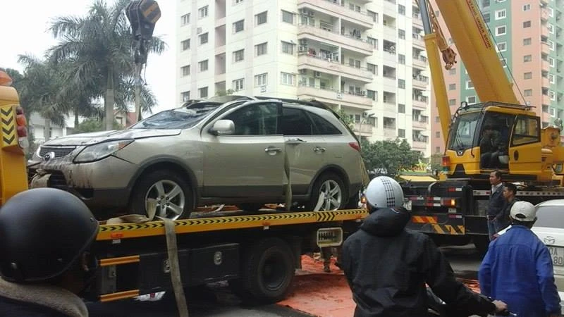 Lực lượng chức năng phải dùng xe cẩu để cẩu chiếc xe.