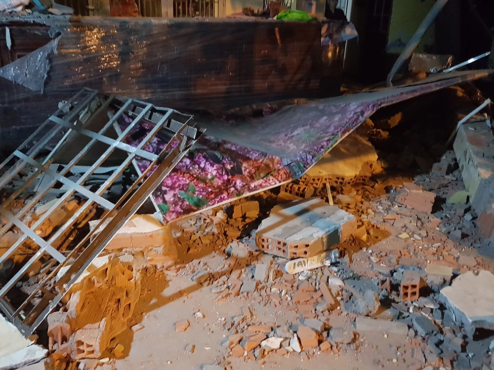 Bức tường bị đổ sập sau cú tông khá mạnh của xe tải. Ảnh: H.TÂM