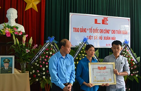 Đại diện của Cục Kiểm lâm và rất nhiều đồng đội, thân nhân của anh đã cùng dự sự kiện đặc biệt này. Không ít người đã rơi lệ khi chứng kiến giây phút vợ anh Hải - chị Tô Thị Thoa và con trai Vũ An Ninh cầm tấm bằng Tổ quốc ghi công của chồng và cha mình.