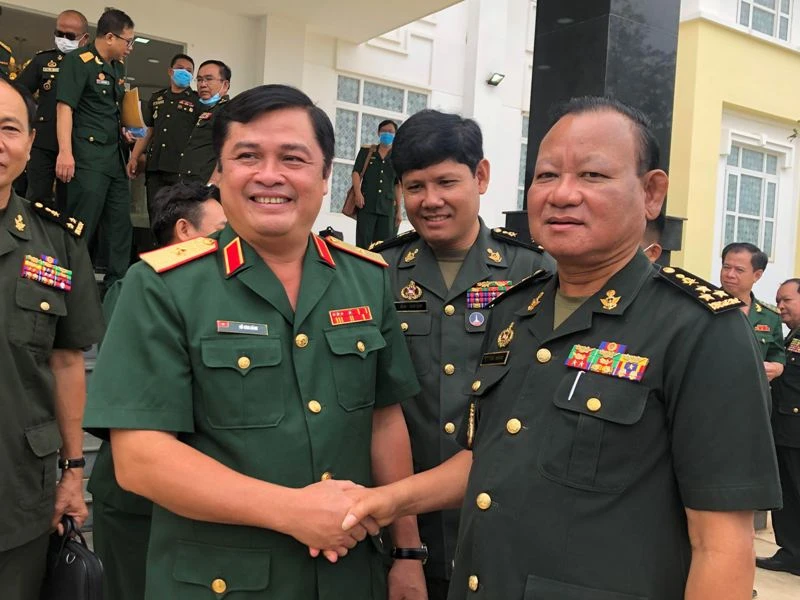 Đại tướng Ek Sam On, Phó Tư lệnh Lục quân, Tư lệnh Quân khu 5 bắt tay Thiếu tướng Đỗ Văn Bảnh, Phó Chính ủy Quân khu 7 trước khi rời Cửa khẩu quốc tế Mộc Bài. Ảnh: PHONG ĐIỀN