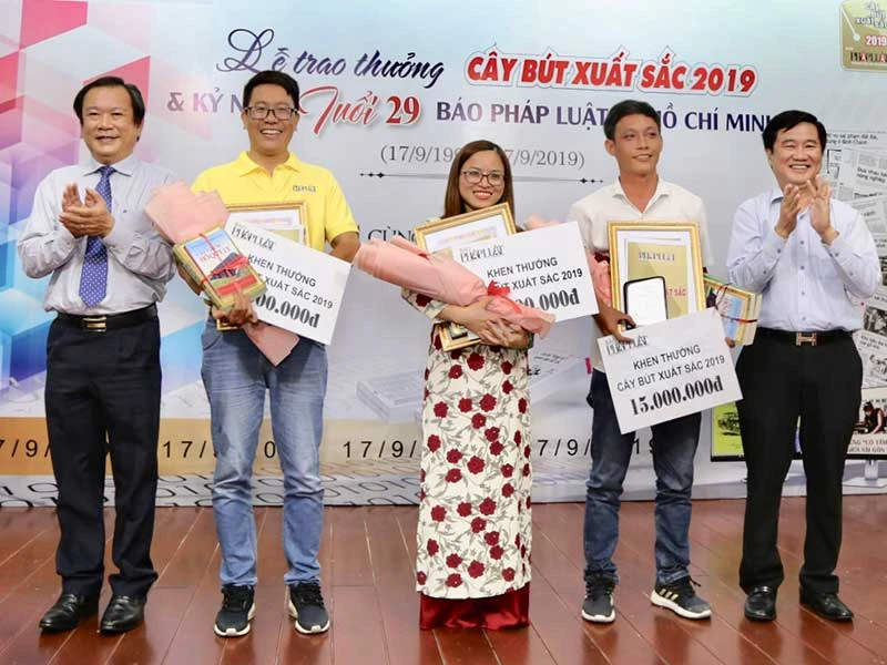 Giám đốc Sở Tư pháp TP.HCM Huỳnh Văn Hạnh (bìa phải) và Tổng biên tập báo Pháp Luật TP.HCM Mai Ngọc Phước trao giải cho các cây bút xuất sắc năm 2019. Ảnh: HOÀNG GIANG