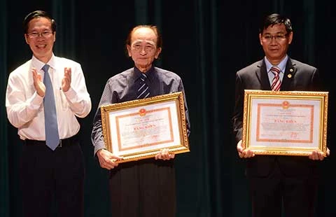 Ông Võ Văn Thưởng, Phó Bí thư Thường trực Thành ủy TP.HCM, trao hai giải A cho hai tác giả Nguyễn Văn Nam và Nguyễn Văn Toàn. Ảnh: QUỲNH TRANG