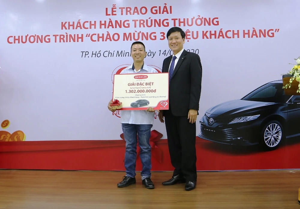Cạnh đó, ông Trần Đình Quân cũng đã trao chìa khóa chiếc xe Toyota Camry 2.5Q trị giá hơn 1,3 tỉ đồng cho ông Lưu Quốc Vinh (TP.HCM) - khách hàng may mắn trúng giải đặc biệt của chương trình khuyến mãi “Chào mừng 3 triệu khách hàng - Ngập tràn quà tặng yêu thương”. Đồng thời, đại diện công ty cũng đã trao thưởng cho khách hàng may mắn trúng các giải thưởng khác của chương trình.