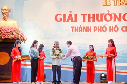 Ông Đào Anh Kiệt, Giám đốc Sở Tài nguyên và Môi trường TP.HCM, Phó trưởng ban thường trực giải thưởng và đại diện báo SGGP trao giải thưởng cho ông Phạm Văn Tân. Ảnh: NGỌC CHÂU.