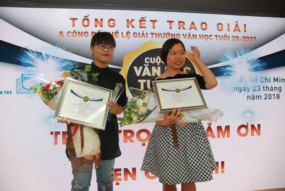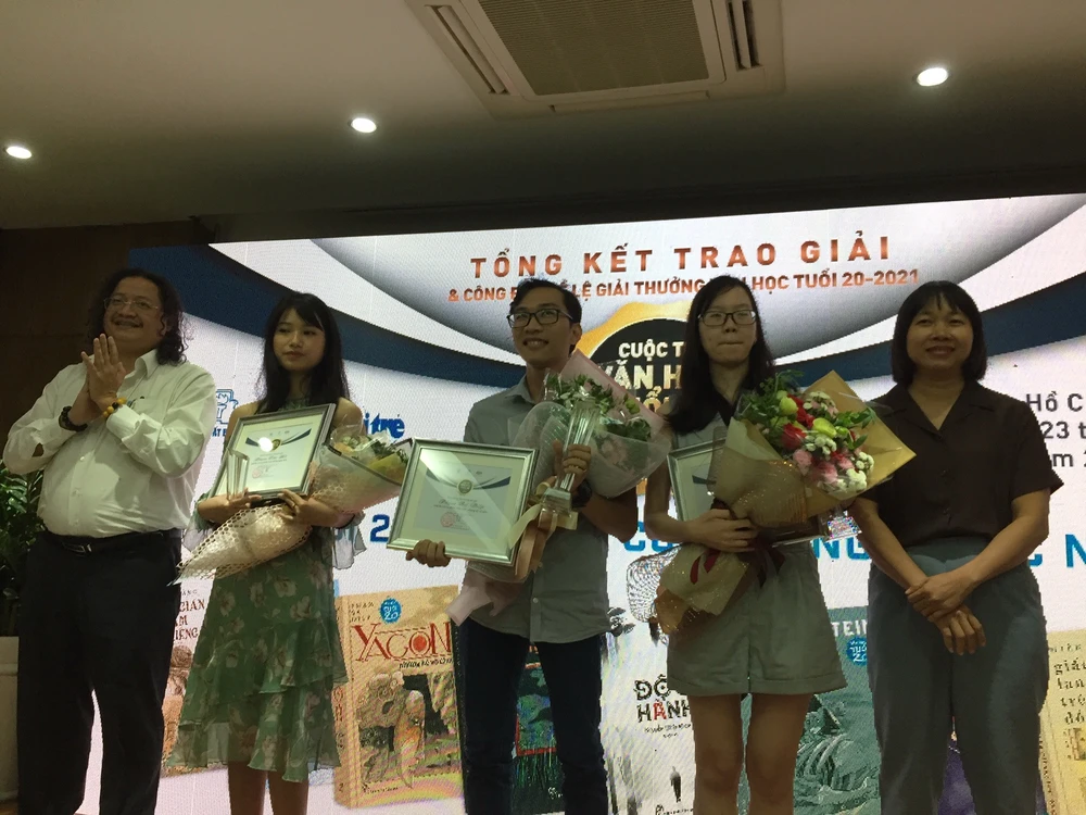 Giám đốc Nhà xuất bản Trẻ Nguyễn Minh Nhựt (bìa trái) và nhà văn Nguyễn Ngọc Tư (bìa phải) trao giải cho ba tác giả trẻ đồng giải ba của cuộc thi.