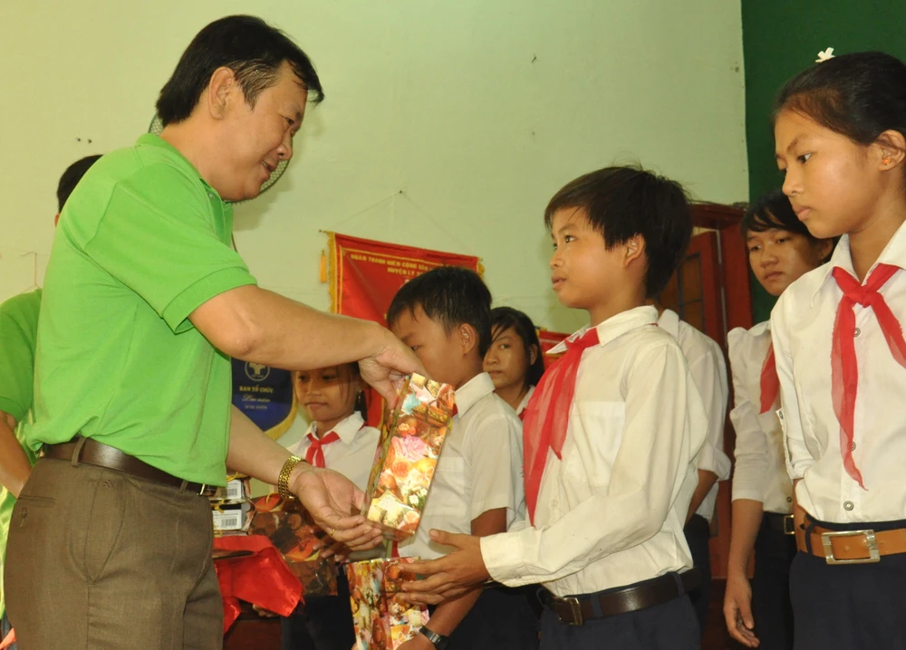 Ông Mai Ngọc Phước, Phó Tổng biên tập phụ trách báo Pháp Luật TP.HCM trao học bổng cho các học sinh trên huyện đảo Lý Sơn.