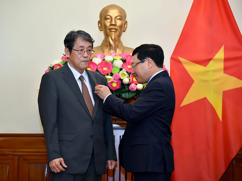 Phó Thủ tướng, Bộ trưởng Bộ Ngoại giao Phạm Bình Minh trao huân chương Hữu nghị cho Đại sứ đặc mệnh toàn quyền Nhật Bản tại Việt Nam Umeda Kunio. Ảnh: BNG