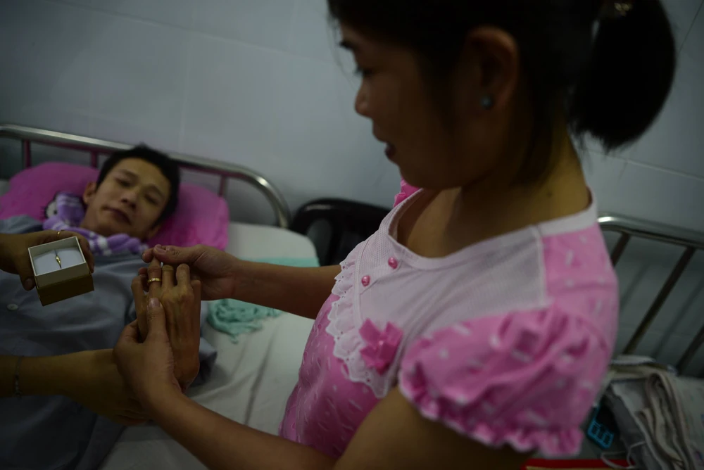 Ở đối diện phòng bệnh anh Thành, cô Nguyễn Thị Hạnh vừa chăm chồng xong liền sang phòng anh Thành chúc mừng. Nhìn thấy tấm ảnh cưới chị Nga đang cầm trên tay, cô Hạnh liền tấm tắc khen “hình cưới hai đứa đẹp lắm!”. Cô Hạnh nói: “Hôm chụp ảnh hai đứa cô không có ở đây, hôm nay nhìn thấy bức ảnh cưới hai đứa cô bất ngờ quá không kìm được nước mắt. Trước giờ, cô rất cảm phục cô Nga, tận tụy chăm sóc Thành mà không ái ngại điều gì, khó có ai mà được như vậy lắm. Chúc cho hai đứa hạnh phúc suốt đời”.